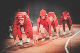 Eine rote Laufbahn mit weißen Linien und vier Menschen, die im Kreis gehen. Gehen ist die Grundbewegungsart der Menschen. Sie treibt sie voran, lässt sie Welt und sich selbst erfahren. Aber was passiert mit den Körpern, wenn ein Fuß vor den anderen gesetzt wird, wenn sie gehen oder laufen, springen, schreiten, schlurfen oder sprinten, wenn sie sich, die Endorphine und den Schweiß zum Fließen bringen?