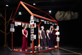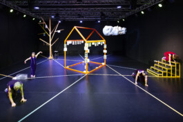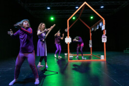 Es beginnt mit dem Geräusch von Wellen, Wasser und Möwengeschrei. Dann treten vier Darsteller*innen in lila Anzügen auf, stellen sich in einen Kreis und wärmen sich für das gemeinsame Spiel auf. Lia leitet die Gruppe an: Sie klopfen entlang ihrer Körper, reiben sich das Gesicht, kreisen mit dem Kopf, dehnen die Arme, atmen tief in den Bauch, beugen die Knie und spreizen die Zehen. Rücken werden geknetet, Finger lang gezogen und dann stapeln sich alle Hände in der Kreismitte übereinander. Lia fragt in die Runde: „Seid ihr bereit?“. Danach betreten alle das orangefarbene Haus und Lia teilt jeder Person ein Tier zu. Ab hier verwandeln sich die Darsteller*innen in Tiere. Hasen, Hühner, Frösche, Schmetterlinge, ein Elefant, eine Schildkröte… vielleicht fängt eine Schlange ein anderes Tier, vielleicht trifft ein Schaf eine Biene, die sticht, vielleicht kochen alle zusammen Pudding oder ein Tiger spielt Flöte. Es gibt Tiergesänge, Seifenblasen, einen Baum voller Instrumente und eine Konfetti-Kanone. Ein Gewitter mit Regen und Blitzen bringt das Haus zum Wackeln und ganz am Ende tanzen alle zusammen zu lauter Musik.